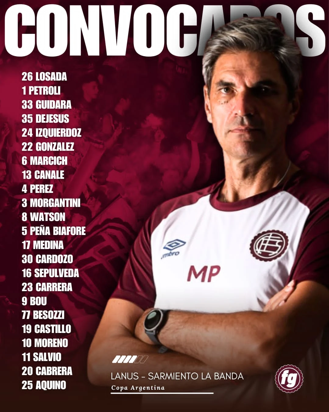 Para éste encuentro -el primero oficial de la temporada 2026-, el Profe dio a conocer la lista de convocados con lo mejor que tiene a su disposición, incluido los tres refuerzos, Tomás Guidara, Matías Sepúlveda y Franco Petroli, así como también el extremo juvenil Lucas Besozzi, que él mismo pidió que sea repescado de Central Córdoba.