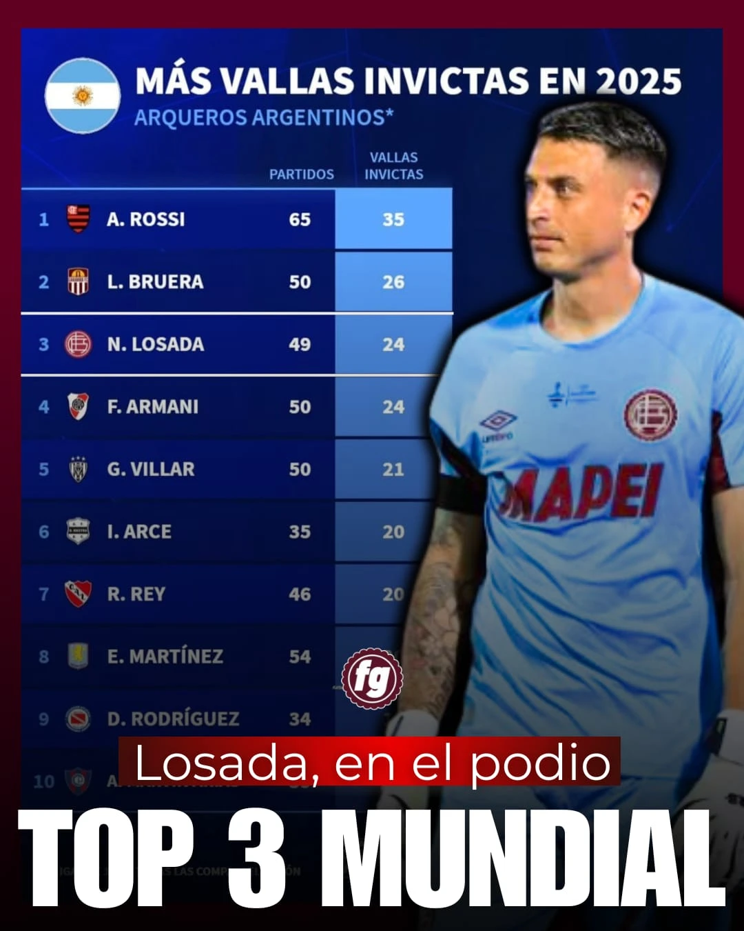 En el mismo orden, el arquero de Lanús ocupó el tercer puesto entre los argentinos con más vallas invictas a nivel mundial en el último año, con 24 partidos sin recibir goles sobre 49 disputados. Losada se ubicó por detrás de Agustín Rossi, con 35 juegos con el arco en cero, y Lucas Bruera (ex Aldosivi, actualmente en Carabobo de Venezuela), con 26, y por encima de nombres propios como Franco Armani y Emiliano Martínez.